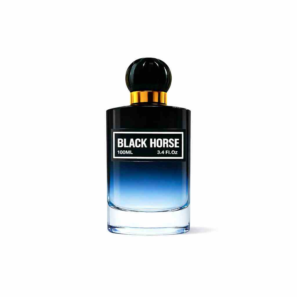 اسم المنتج : عطر بلاك هورس رجالي : هو عطر فواح ذو رائحة فريدة تدوم طويلاً، مثالي لكل من يسعى للتميز والانتعاش اليومي. يتميز هذا العطر بتصميمه الأنيق، حيث يأتي في زجاجة ذات ألوان متدرجة من الأسود العميق إلى الأزرق الفاتح، مما يضفي لمسة من الفخامة. الزجاجة مصنوعة من زجاج لامع، مما يعكس الضوء بطريقة جذابة، كما أن غطاء الزجاجة ذو تصميم دائري مع لمسة من الذهب، مما يزيد من جاذبيتها.
